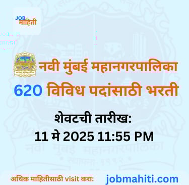 नवी मुंबई महानगरपालिका यांनी आता ६२० विविध पदांसाठी भरती जाहिरात जाहीर केली आहे. सरकारी नोकरीची संधी शोधणाऱ्या उमेदवारांसाठी ही एक उत्तम संधी आहे, कारण यात विविध शैक्षणिक व व्यावसायिक पार्श्वभूमी असलेल्या उमेदवारांसाठी स्थान आहेत.