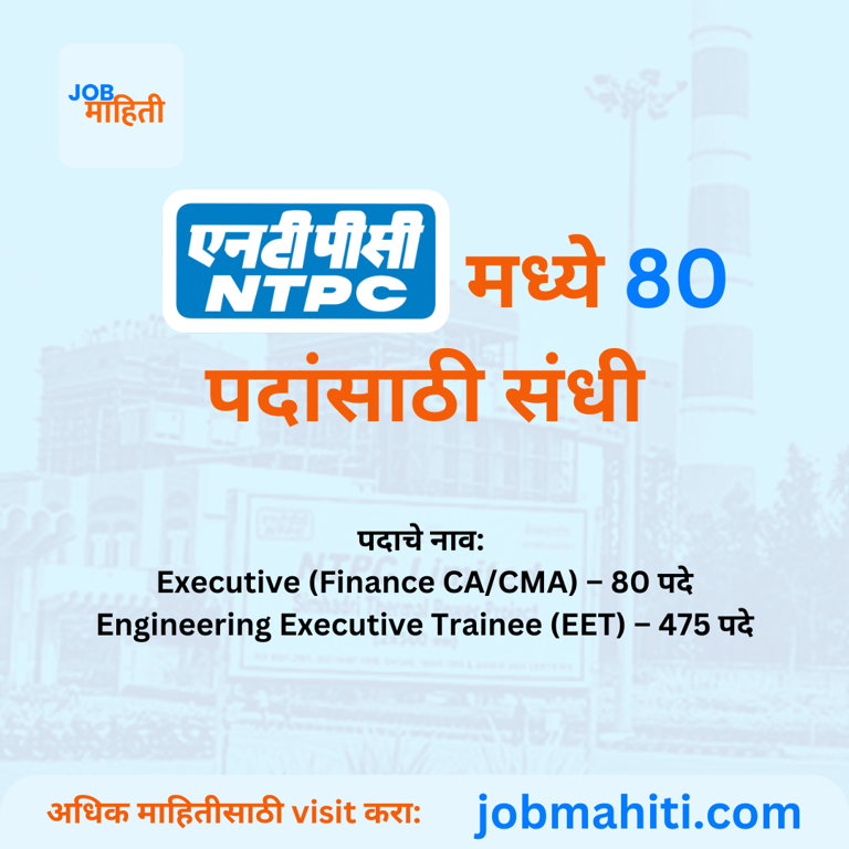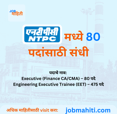 सरकारी नोकरीच्या शोधात असलेल्या उमेदवारांसाठी आनंदाची बातमी! नॅशनल थर्मल पॉवर कॉर्पोरेशन लिमिटेड (NTPC) ने 80 कार्यकारी (Executive) पदांसाठी भरती जाहीर केली आहे. भारतातील सर्वात मोठी ऊर्जा उत्पादक कंपनी असलेल्या NTPC मध्ये नोकरी मिळवण्याची ही सुवर्णसंधी आहे. इच्छुक आणि पात्र उमेदवारांनी लवकरात लवकर अर्ज करावा.